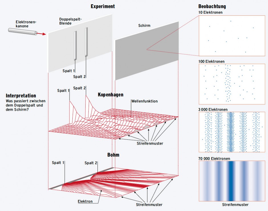 Diese Erklärungslücke versucht die „Kopenhagener Deutung“ zu schließen, indem sie schlichtweg verbietet, während des unbeobachteten Fluges durch den Spalt zum Schirm von einem Teilchen oder dessen Weg zu sprechen. Bevor es nicht registriert wurde, existiert einfach kein Elektron, nur eben dessen Wellenfunktion (die durch ein rotes Netz angedeutete Fläche in der Mitte der Graphik). Die Zufälligkeit, mit der ein Teilchen hier oder dort auftaucht, gilt als fundamentale Eigenschaft der Materie, sie ist Elektronen oder Atomen „intrinsisch“.