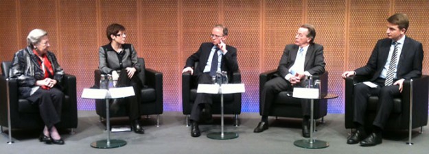 Auf dem Podium v.r.n.l.: Jutta Allmendinger (55), Soziologin und Präsidentin des Wissenschaftszentrums Berlin für Sozialforschung, Jean-Marie Robine (Jahrgang ca. 1960), Institut national de la santé et de la recherche médicale in Paris, Timothy Ma Kam Wah (Alter unbekannt), Senior Citizen Home Safety Association in Hong Kong, Monika Queisser (Alter unbekannt), OECD in Paris, Joshua Goldstein (46), Direktor des Max-Planck-Instituts für demografische Forschung in Rostock, Moderation: Judy Dempsey (Jahrgang 1956), Senior International Correspondent, u.a. New York Times.