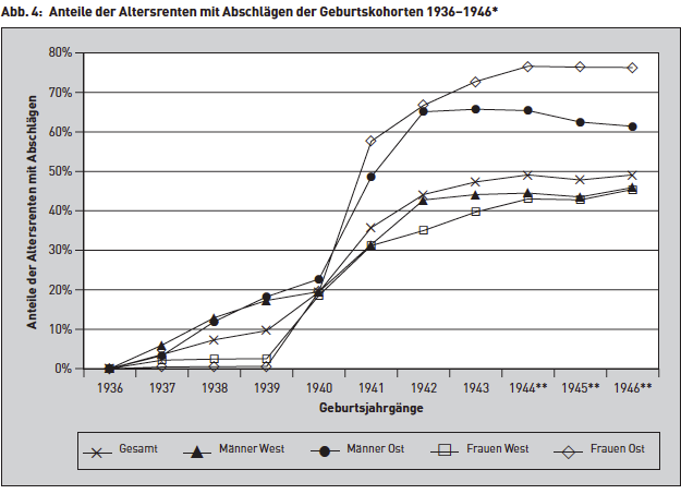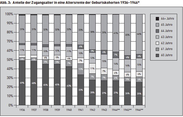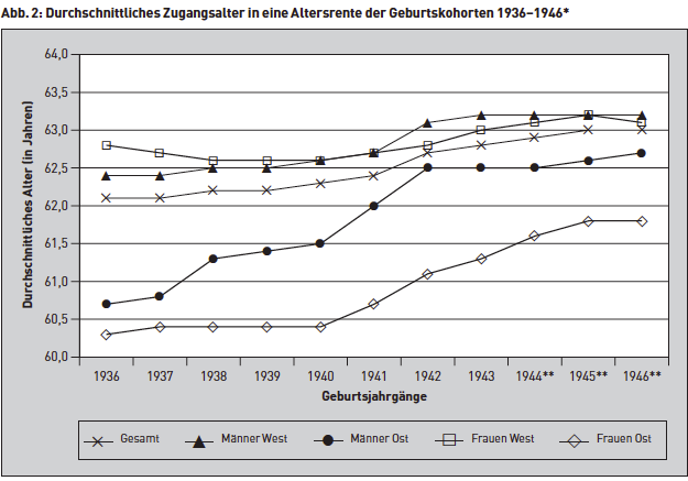 Gingen vom 1940er-Jahrgang erst 32 Prozent mit 65 (also im Jahr 2005) in Altersrente, waren es in der 1945er-Kohorte (wurde 2010 65) schon 45 Prozent. Dazu passt, dass das durchschnittliche Zugangsalter der Jahrgänge kontinuierlich steigt: