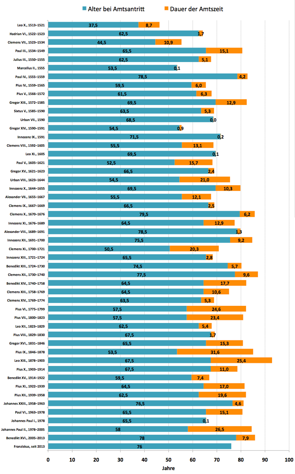 Anmerkung: Die Altersangaben stimmen nur +/- ein Jahr (außer für die letzten drei Päpste, dort exakt). Es wäre zu aufwändig gewesen, für jeden Papst zu prüfen, ob er schon Geburtstag hatte, als er ins Amt kam. Ich habe einfach gerechnet: Eintrittsalter = Geburtsjahr – Jahr des Amtsantritts. Damit die Statistik im Mittel stimmt, habe ich allen Päpsten dann ein halbes Jahr abgezogen.