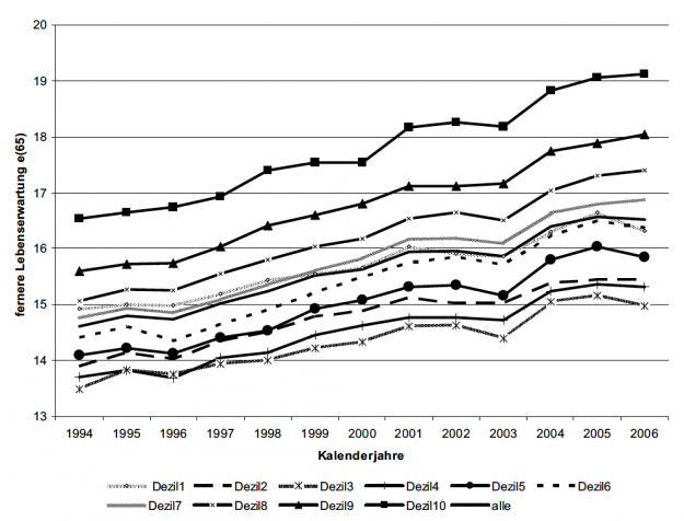 Das vermeintliche Sinken der „Lebenserwartung“ ist ein rein statistisches Artefakt; tatsächlich steigt die Lebenserwartung auch für Geringvediener. weiter…